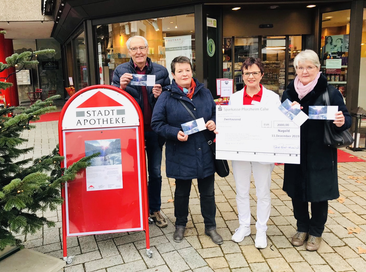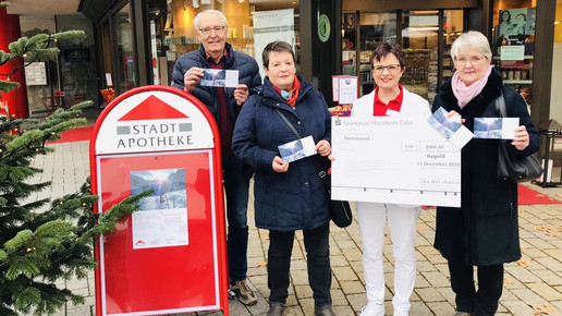 Früher gab es Weihnachtsgeschenke für die Kunden in der Stadt-Apotheke im baden-württembergischen Nagold. „Doch solche Präsente braucht ja niemand wirklich“, dachte sich Inhaberin Bärbel Reichert-Fehrenbach. Und so überreicht die Apothekerin seit Jahren statt Kundengeschenken lieber Spendenschecks, um soziale Einrichtungen in der Stadt zu fördern. In diesem Jahr durften sich vier regionale Institutionen über insgesamt 2000 Euro freuen.
