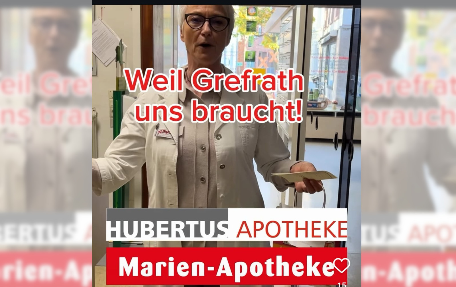 Am Ende der Reels erscheint immer das Logo beider Betriebe und der Slogan „Weil Grefrath uns braucht“. Gezeigt werde, was die Apotheke leiste. „Die Leute sollen sehen was passieren würde, wenn die Apotheken nicht mehr da wären“, sagt von Laguna von der Hubertus-Apotheke. Eine Apotheke sei eben keine Abgabestelle wie das Internet. „Die Apotheken am Ort müssen den Grefrathern so lieb und teuer werden, dass sie nicht mehr darauf verzichten wollen und sich hinter uns stellen.“ Wie lange die Reels noch laufen, ist offen. „Wir haben Ideen für ein Jahr.“