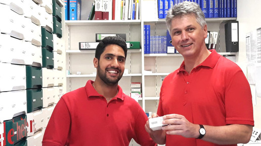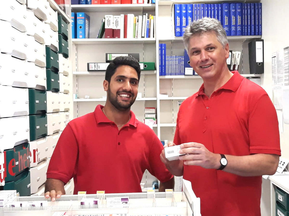 Zwischen Praktikant, Chef, Mitarbeitern und Kunden habe es sofort geklickt, erzählt der Inhaber. Auf das Praktikum folgte eine sechsmonatige Einstiegsqualifizierungsmaßnahme, die ab dem 1. September in eine PKA-Ausbildung mündet. „PKA ist ein guter Beruf mit Zukunft“, findet Alzarqway. „Medikamente annehmen, sortieren, bei Bedarf neu bestellen, auf den Bestand und das Verfallsdatum achten und den Namen von allen Medikamenten lernen – das ist alles sehr interessant, aber auch eine große Herausforderung.“