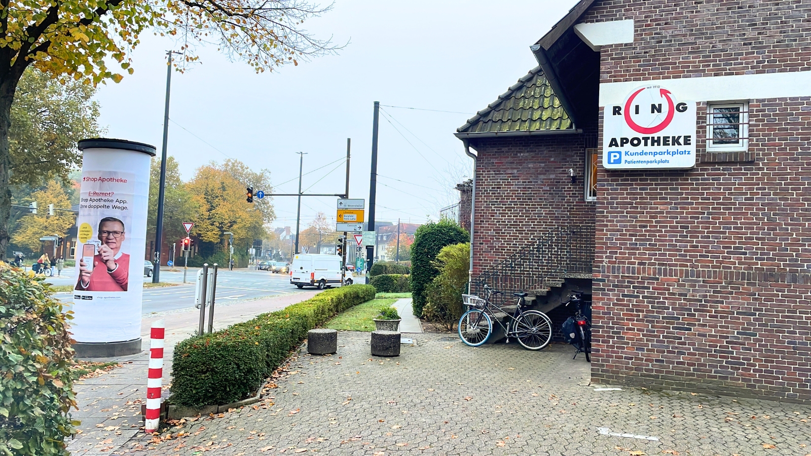 Die Igel-Apotheke befindet sich in einem Ärztehaus, direkt gegenüber der Bushaltestelle. Diese liegt in der Hand der Stadt, die entsprechend auch die Werbefläche vergibt. „Nie wieder doppelte Wege“, titelt Shop Apotheke hier mit dem Testimonial. „Das wirkt so, als hätten wir ständig Nachlieferungen“, ärgert sich Inhaber Deniz Buchholz.