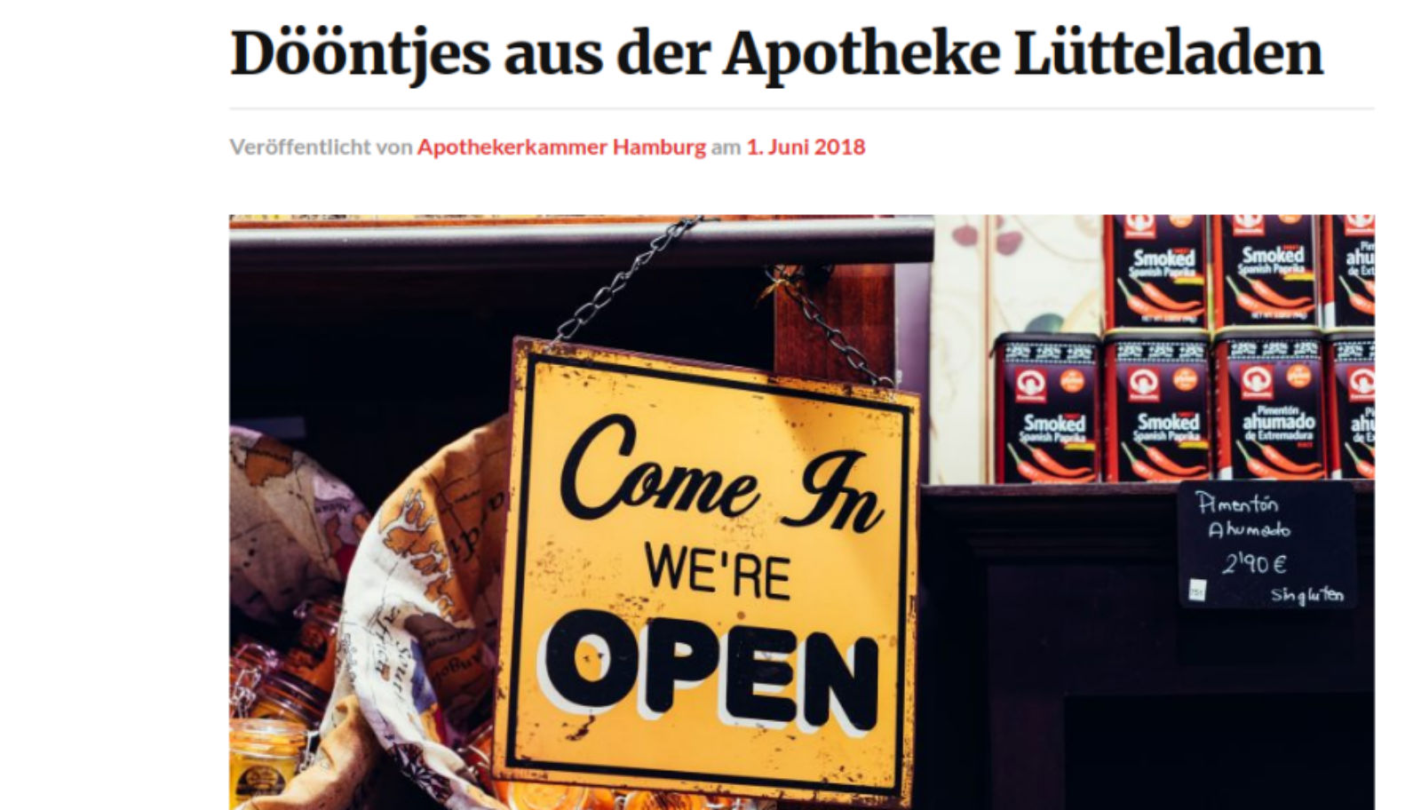Die Verantwortlichen der Kammer haben sich dieses neue Angebot ausgedacht und betreiben den Blog mit Pharmazeuten aus der Kammer. Ein Apotheker bestückt speziell die Rubrik „Dööntjes aus der Apotheke“, die über spannende, lustige und skurrile Geschichten aus dem Apothekenalltag Hamburgs berichtet.