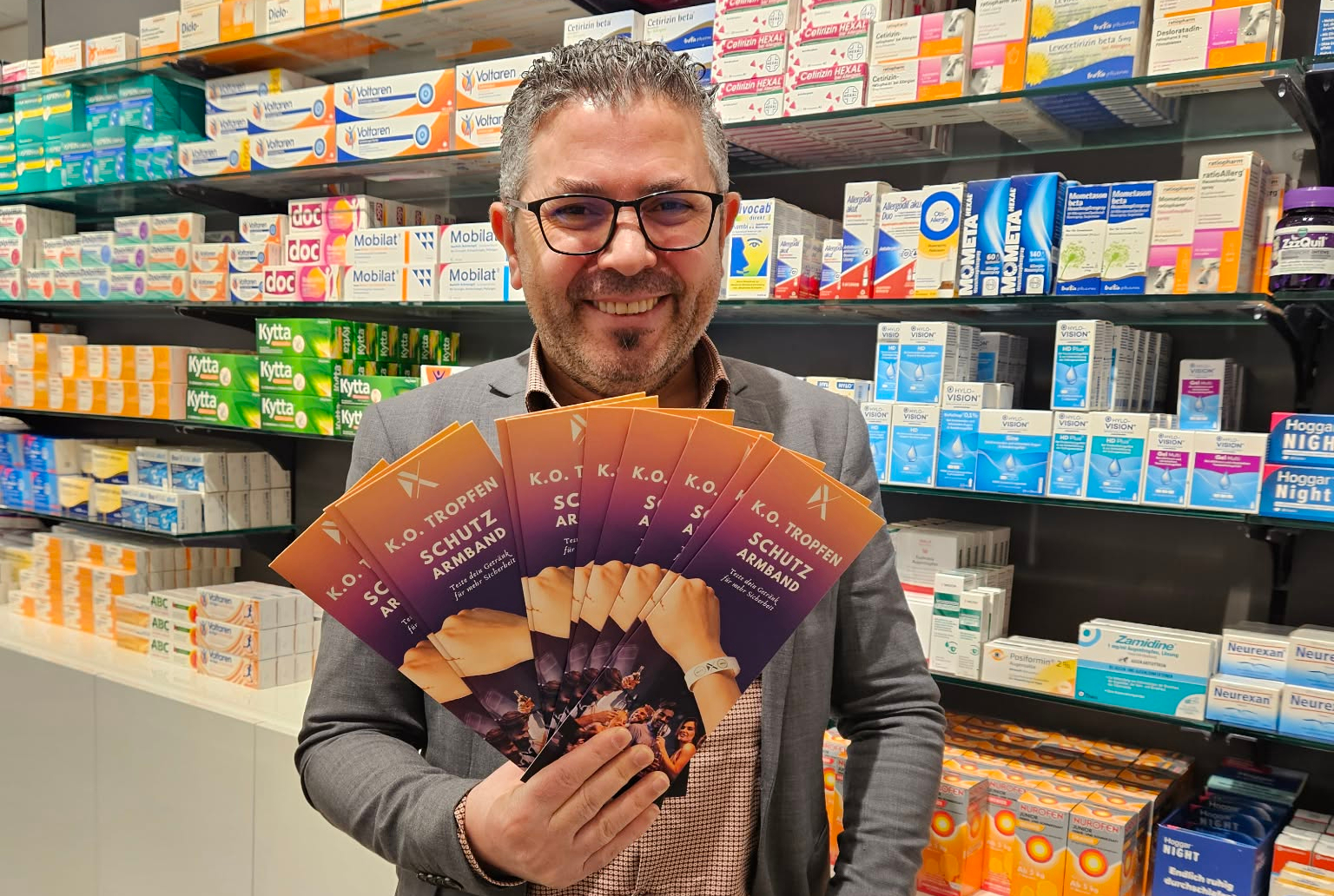 In der fünften Jahreszeit geht es mitunter heiß her. Zu Karneval beziehungsweise Fasching haben Apotheken deshalb ihr Sortiment erweitert und bewerben K.o.-Tropfen-Testarmbänder. Die Nachfrage sei vorhanden, sagt Mustafa Bagli von der Schiller Apotheke in Duisburg.