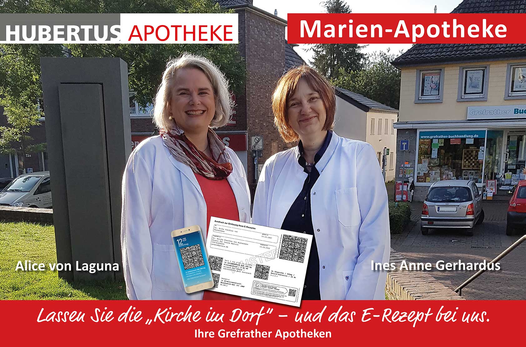 Jetzt sei sie die „direkte Antwort“ auf das, was DocMorris und Shop Apotheke derzeit lieferten: „Bis Dezember plakatieren wir die ganz großen Werbeflächen in Grefrath, Vinkrath, Mülhausen und Oedt mit eigenen Motiven.“ Ein Plakat zeigt Gerhardus mit ihrer Kollegin Alice von Laguna und dem Slogan „Lassen Sie die Kirche im Dorf und Ihr E-Rezept bei uns!“. Beide seien ortsbekannt und die Plakate würden daher große Aufmerksamkeit erregen und Diskussionen auslösen.