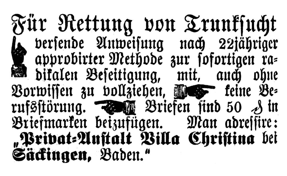 Andere Kollegen hätten sich dagegen sehr in der Aufklärung vor den Gefahren des Alkoholmissbrauchs engagiert. Sie brauten Haus- und Heilmittel und engagierten sich im Blaukreuz-Verein, der alkoholfreie Restaurationen unterstützte. Doch nicht all diese Antidote entfalteten eine heilende Wirkung: „Das von dem Apotheker Günther zu Altona seit einiger Zeit in öfffentlichen Blättern angepriesene Geheimmittel gegen Trunksucht ist von dem Berg-Commissair Stromeyer zu Hannover untersucht und von demselben für gesundheitsnachtheilig erklärt“, schrieb 1862 die Königlich-Hannoversche Landdrostei. „Wir können daher nicht unterlassen, gegen den Gebrauch dieses Geheimmittels dringend zu warnen.“