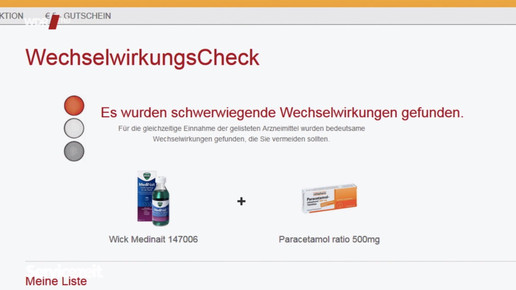 Nicht so okay findet der Mediziner allerdings, dass nur zwei Versender vor der Kombination aus Wick Medinait und Paracetamol warnen. Bei Apo-Discounter können beide Präparate in einem Wechselwirkungscheck eingegeben werden. Wer selbst aktiv wird, wird auch gewarnt: „Es wurden schwerwiegende Wechselwirkungen gefunden.“ Mehr Informationen dazu gibt es aber nicht. Die Tester fühlen sich „ziemlich allein gelassen“. Eine Erläuterung konnte jedoch per Mail angefordert werden. DocMorris schneidet besser ab – der Versender gibt die Erklärung sofort und weist auf eine Überdosierung durch den gleichen Wirkstoff hin. Doc Esser findet das „richtig gut“. Auf schnelle Art und Weise gelange der Verbraucher zum Wechselwirkungungscheck, der alle benötigten Antworten liefere.