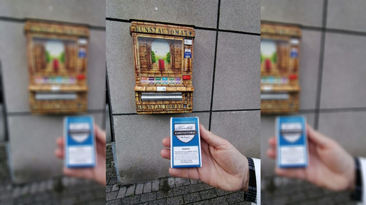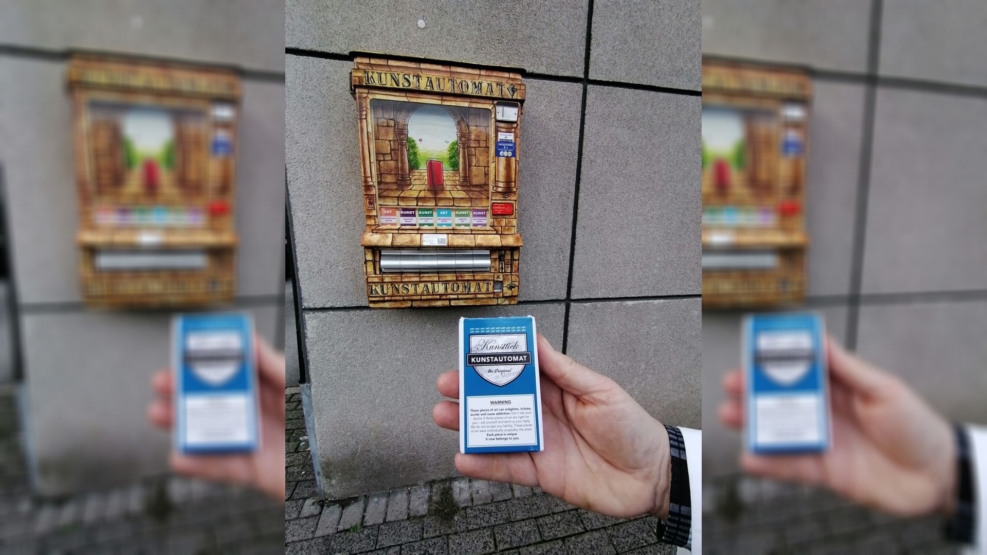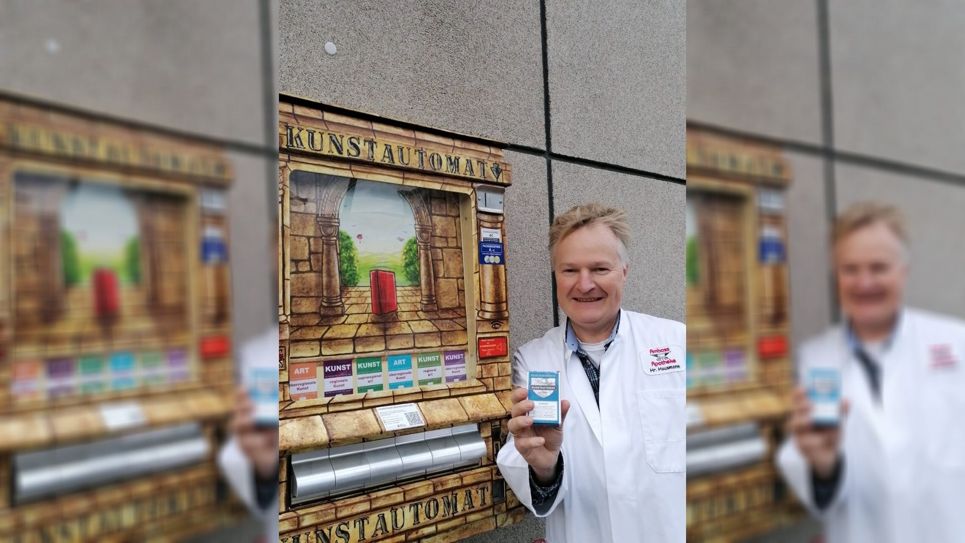 Ein Zigaretten-Automat an der Fassade einer Apotheke? Auf den ersten Blick scheint dies fehl am Platze zu sein. An der Amboss-Apotheke in Wuppertal können jedoch keine Glimmstängel, sondern Mini-Kunstwerke aus einem umgebauten Zigaretten-Automaten gezogen werden.