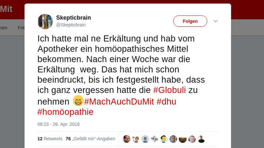 Etwa 30 Morphin-Globuli mit der Potenz C 200 soll der Patient auf einmal eingenommen haben. Nach der Einnahme der Kügelchen kam es zu zentralnervösen Nebenwirkungen wie Atemdepression, Halluzinationen und Bewusstseinsstörungen. Glücklicherweise hat der homöopathische Notdienst schnell reagiert und ein entsprechendes Notfallmedikament zeitnah verabreicht. Eine homöopathisch verdünnte Naloxon-Infusion konnte dem Mann das Leben retten.