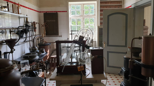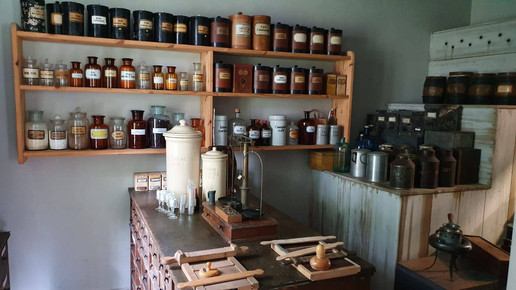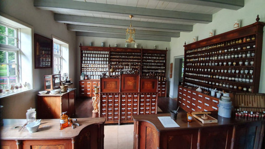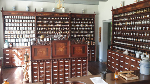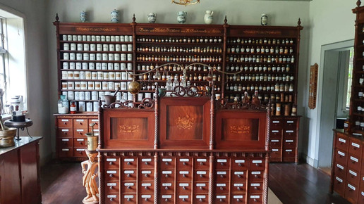 Das Geld dafür musste er sich zunächst borgen, was an vielen Schuldverschreibungen zu sehen ist, die den Treppenaufgang des Hauses säumen. Die Offizin ist komplett aus Mahagoni gefertigt und es gibt aufwändige Intarsienarbeiten im Holz zu entdecken. Hier wurde noch bis ins Jahr 1970 ganz regulär gearbeitet. Zu sehen sind ein Büro, das auch als Nachtdienstzimmer diente, die Offizin, eine Gerätekammer, ein Labor und eine Rezeptur. Die Räumlichkeiten stammen nicht alle aus derselben Apotheke, jedoch sind sie alle etwa gleich alt.