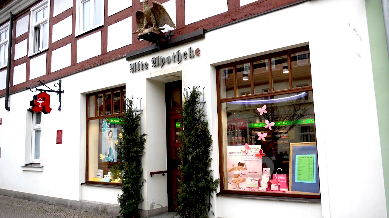 Der große Adler über der Tür erinnert noch an frühere Zeiten. Denn die Alte Apotheke wurde als Adler Apotheke betrieben. Auch in der DDR war der Betrieb nicht unterbrochen. In den historischen Räumen wurde ein pharmazeutisches Zentrum betrieben. Nach einem Besitzerwechsel wurde sie umbenannt.