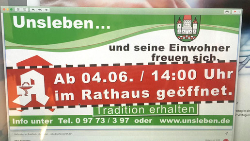 In der kleinen fränkischen Gemeinde Unsleben hat die Arzneimittelversorgung politische Bedeutung erlangt. Nach der Schließung der Kreuz-Apotheke wird kurzerhand im Rathaus provisorisch ein neuer Betrieb eröffnet. Die Gemeinde weist mit einem Großplakat vor dem leerstehenden alten Lokal auf die „Not-Apotheke“ hin. Ein Einzug am alten Standort ist noch nicht möglich.