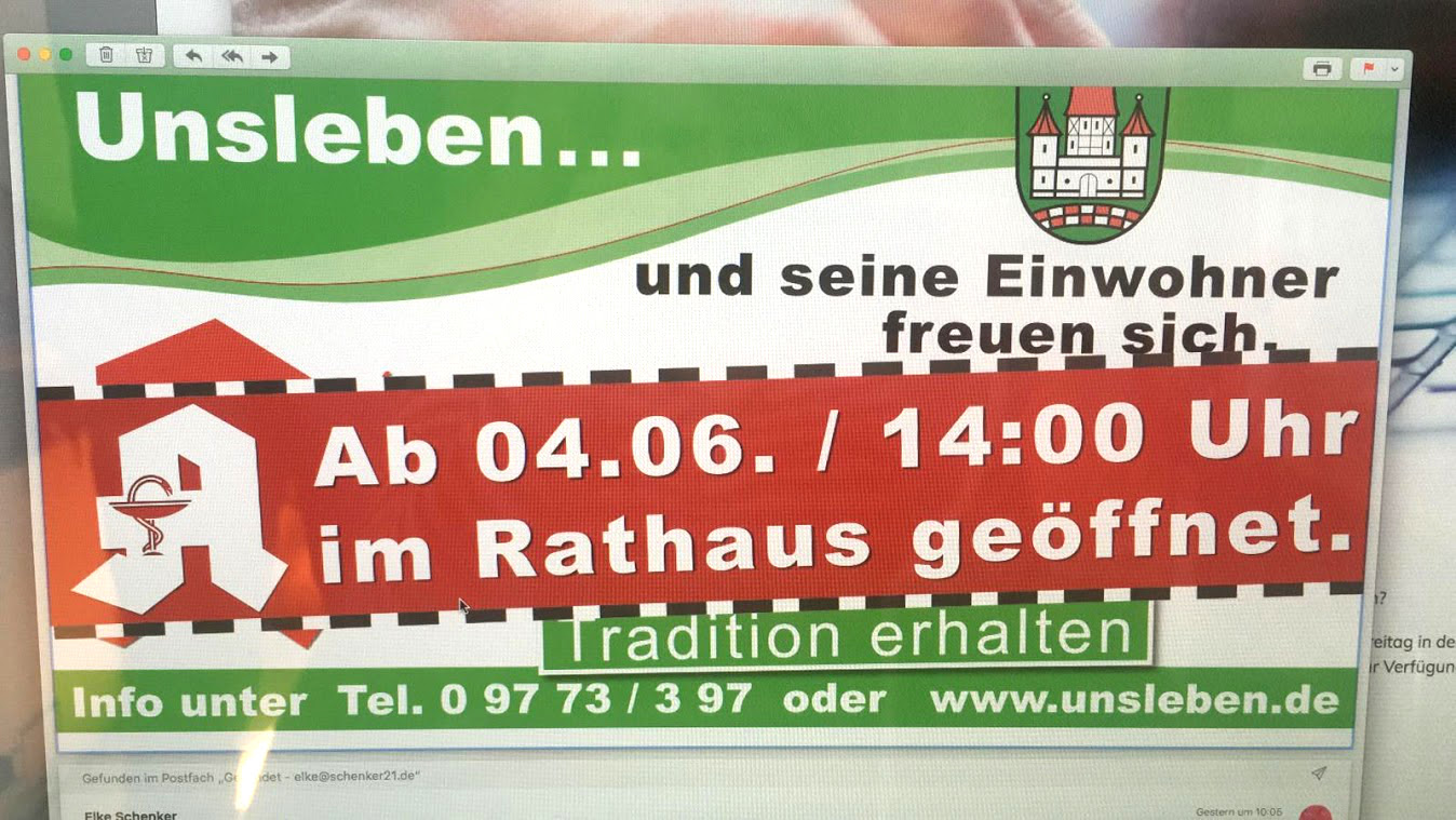 In der kleinen fränkischen Gemeinde Unsleben hat die Arzneimittelversorgung politische Bedeutung erlangt. Nach der Schließung der Kreuz-Apotheke wird kurzerhand im Rathaus provisorisch ein neuer Betrieb eröffnet. Die Gemeinde weist mit einem Großplakat vor dem leerstehenden alten Lokal auf die „Not-Apotheke“ hin. Ein Einzug am alten Standort ist noch nicht möglich.