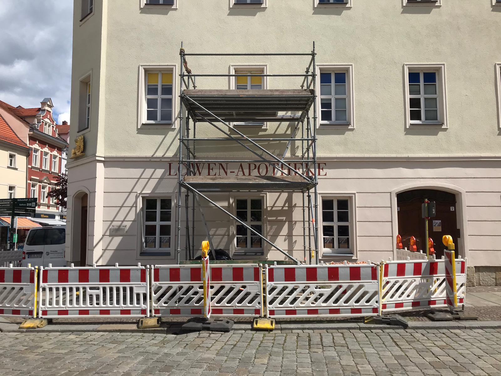 Doch immerhin haben sie dann die ständige Rennerei hinter sich. Denn mehr als die Hälfte des Generalalphabets, Labor und Rezeptur waren auch nach der Evakuierung in dem Teil des Gebäudes verblieben, der nicht einsturzgefährdet ist. Für Boragk und ihre Mitarbeiter heißt das: Sie müssen ständig die 150 Meter von der Behelfsoffizin in die eigentliche Apotheke und zurück, um Ware zu holen. „Das ist schon ein logistischer Mehraufwand. Ich weiß nicht, wie viele Kilometer wir da am Tag zurücklegen“, erzählt sie. „Aber wenigstens hatten wir keinen Schnee und keinen Regen. Damit wäre es noch viel schwerer gewesen.“ Denn der Marktplatz ist mit ebenfalls historischem Kopfsteinpflaster belegt. „Da kann man leicht umknicken, wenn man eine schwere Kiste trägt und nicht nach unten schauen kann.“