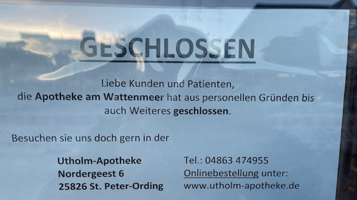 Die Apotheke am Wattenmeer will das Paar aber noch nicht ganz aufgeben. „Wir behalten uns vor, wieder zu eröffnen.“ Die Apotheke sei auf neustem Stand und revisionssicher. Der Mietvertrag laufe noch einige Jahre. Wiedereröffnet werde, wenn sich ein Personalsegen ergebe oder sich die Infrastruktur des Ortes ändere.