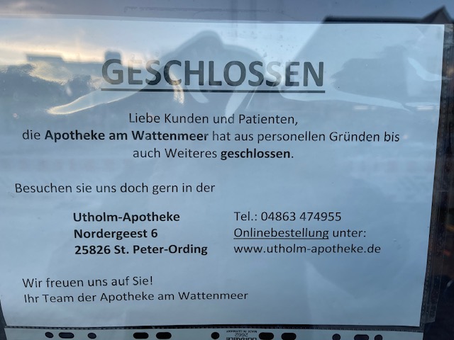 Die Apotheke am Wattenmeer will das Paar aber noch nicht ganz aufgeben. „Wir behalten uns vor, wieder zu eröffnen.“ Die Apotheke sei auf neustem Stand und revisionssicher. Der Mietvertrag laufe noch einige Jahre. Wiedereröffnet werde, wenn sich ein Personalsegen ergebe oder sich die Infrastruktur des Ortes ändere.