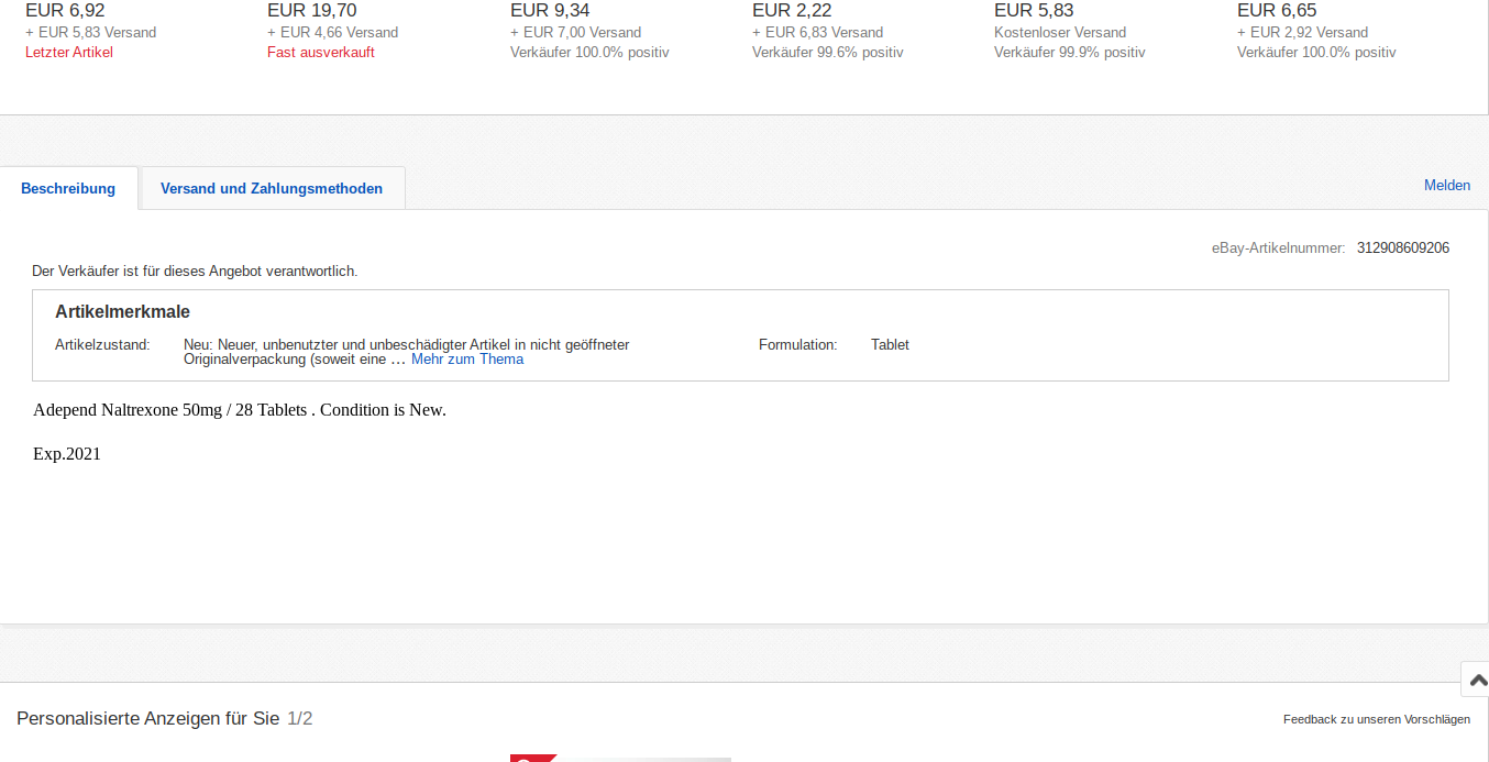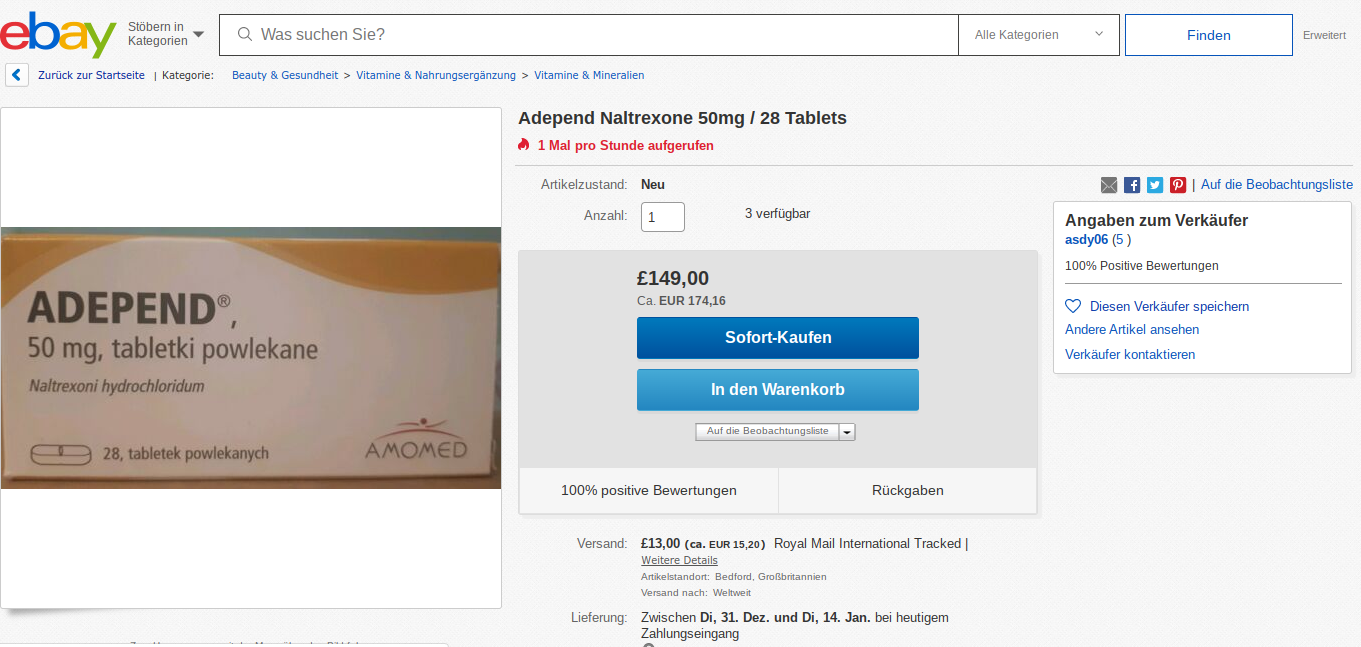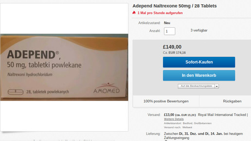 Aus dem englischen Bedford wollte der Ebay-Nutzer asdy06 die Naltrexon-Packung in die ganze Welt verschicken. Die 28 Filmtabletten wurden zum Sofortkauf für 149 Britische Pfund, umgerechnet knapp 175 Euro, angeboten. Hinzu wären 13 Pfund beziehungsweise 15,20 Euro für den Versand mit der Royal Mail International gekommen. Damit wäre der Kauf kostspieliger als in deutschen Apotheken, wo das Arzneimittel des Herstellers Amomed ab circa 110 Euro verfügbar ist. Als Lieferzeit wurden eine bis drei Wochen angegeben.