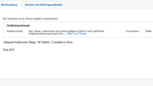 Der Wirkstoff Naltrexon soll Suchtkranken helfen, die Opioid-Abhängigkeit zu überwinden. Obwohl entsprechende Medikamente verschreibungspflichtig sind, tauchte das Arzneimittel Adepend des Herstellers Amomed auf der Auktionsplattform Ebay auf. Angeboten wurde das Präparat von einem Händler aus Großbritannien.