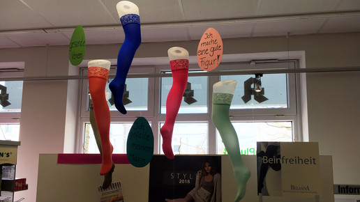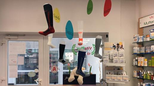 Kunden sollen alle Strümpfe zählen, um einen von drei Schoko-Osterkörben zu gewinnen. „Wir wollen als Venenfachcenter bekannter werden“, so Thanner. Immer wieder kämen Kunden mit schlecht angepassten Strümpfen. Die Apotheke wird in diesem Jahr erstmals mit bunten Strümpfen dekoriert. Generell gibt es jährlich mindestens eine Aktion.