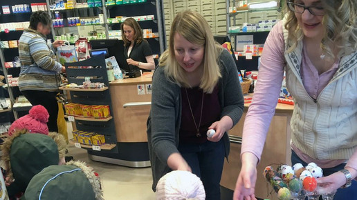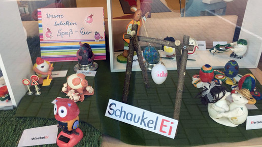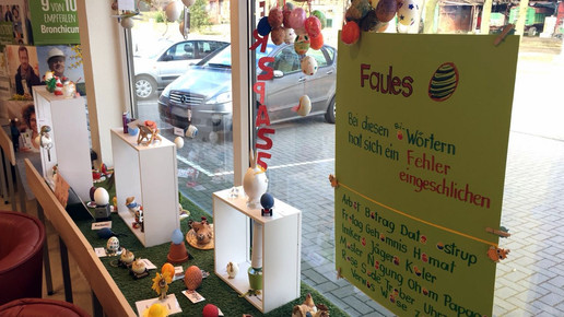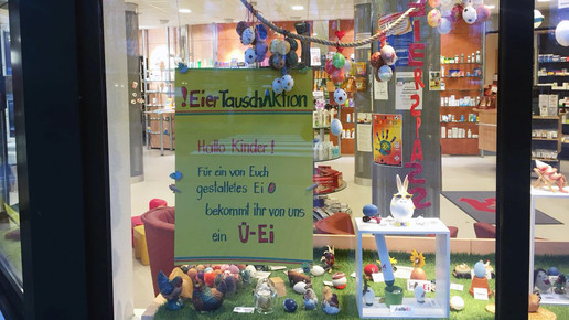Auch in der Neuen Apotheke im fränkischen Stegaurach wird österlich dekoriert. Inhaberin Bettina Thiel hat im Schaufenster farbige Eier versteckt. Große und kleine Kunden sollen dem Osterhasen helfen, die Stückzahl zu ermitteln. Das Ergebnis soll in ein Teilnahmeformular eingetragen werden. Ende März werden die Gewinner gezogen. Das Team der Apotheke denkt sich jedes Jahr eine neue Aktion aus. Die Dekoration wird einem Profi überlassen. Auch in der Bahnhof-Apotheke in Freilassing lädt das Team zum Eierzählen im bunt geschmückten Schaufenster ein.