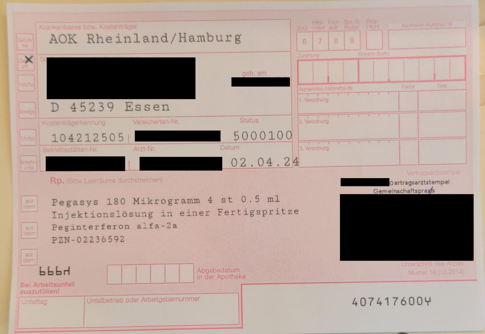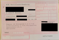 Bereits Mitte März hatte es gefälschte Muster-16-Rezepte mit Pegasys in Berlin gegeben, auch hier: ein fehlerhafter Vertragsarztstempel und die fehlende Dosierung.