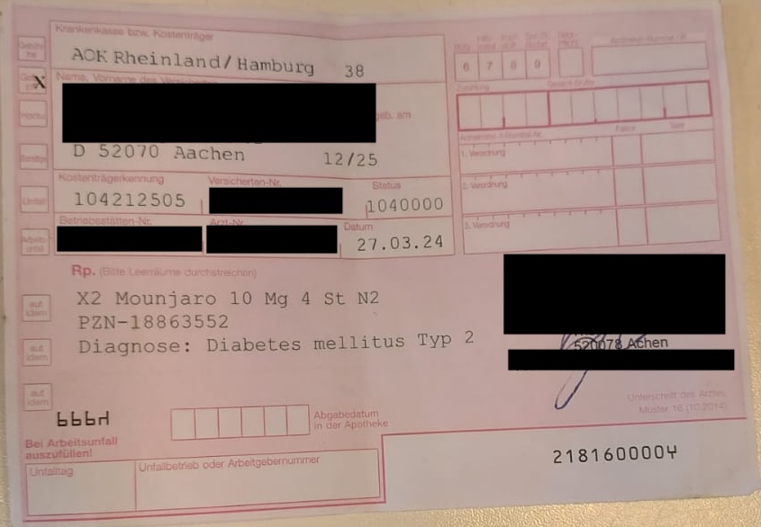 In Aachen haben es Fälscher auf Mounjaro (Tirzepatid) abgesehen. Auch hier: Der Vertragsarztstempel ist unvollständig und fehlerhaft. Für Einheimische besonders auffällig: Der Stadtname kommt hier ohne zweites A aus. Darüber hinaus fehlt die Dosierangabe.