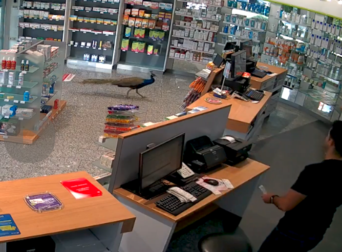 Ein Angestellter, der gerade hinter der Kasse saß, stand auf und eine weitere Mitarbeiterin kam dazu. „Sie fanden es lustig und waren erstaunt“, sagt Bagli. Kurz nach dem Pfau kam eine Kundin in die Apotheke, die sich ebenfalls über den ungewohnten Anblick freute. „Sie fragte, ob das unser Haustier ist“, sagt der Apotheker. Gemeinsam geleiteten die drei das Tier behutsam nach draußen und der Pfau flog letztlich weg.
