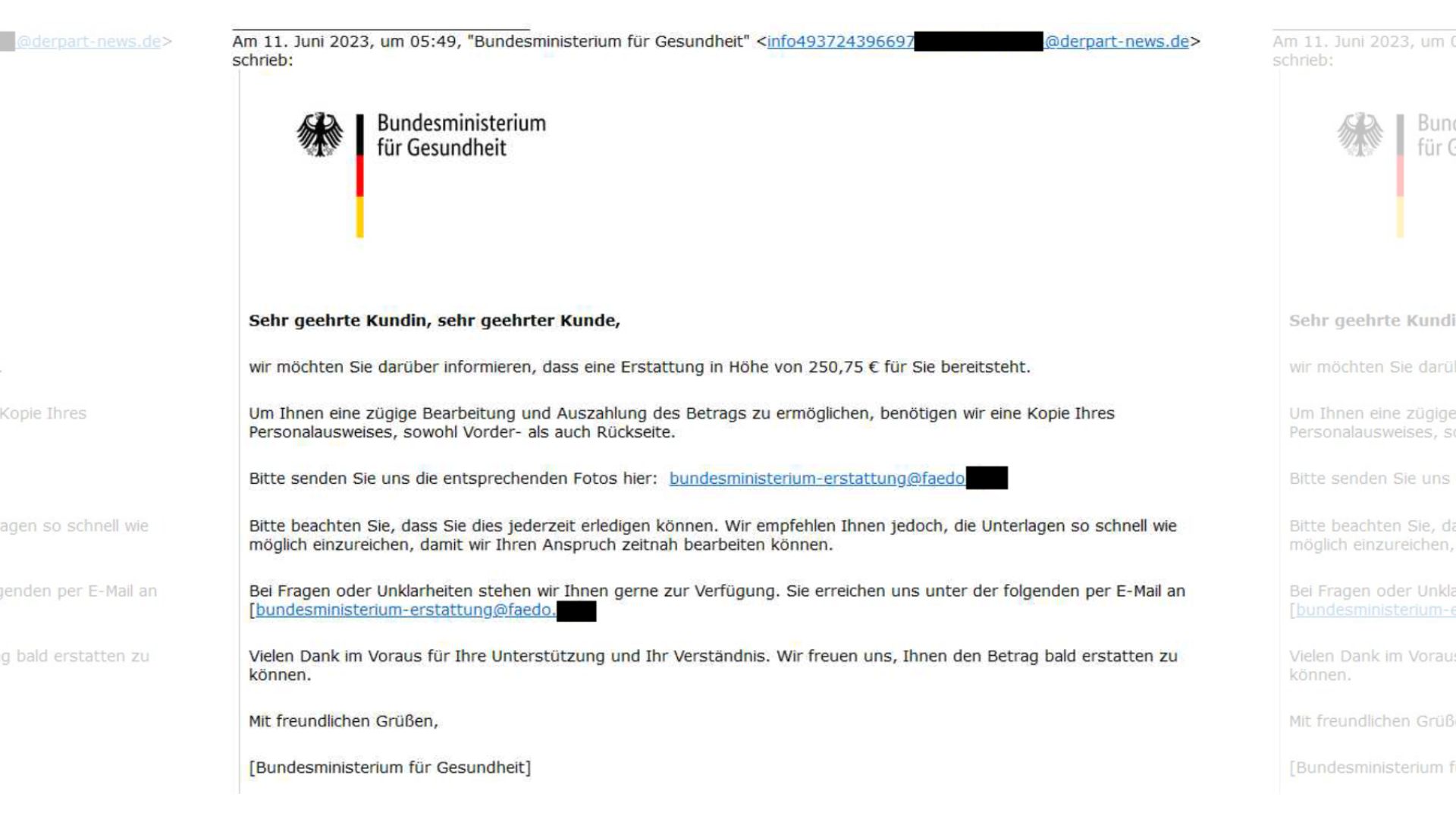 In der E-Mail, die aktuell angeblich durch das Bundesgesundheitsministerium verschickt wird, werden der „sehr geehrte Kunde“ oder die „sehr geehrte Kundin“ darüber informiert, dass die Erstattung eines Geldbetrages veranlasst werden soll. Dafür sollen die Angeschriebenen lediglich eine Kopie der Vorder- und Rückseite ihres Personalausweises an eine E-Mail-Adresse übermitteln.