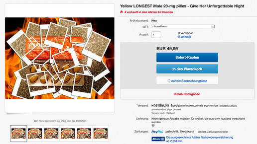 Potenzmittel wie Sildenafil oder Tadalafil gehören zu den am häufigsten angebotenen Rx-Arzneimitteln auf dem Auktionsportal Ebay. Nicht nur Ware aus Deutschland, auch im Ausland erworbene Präparate werden regelmäßig verkauft. Erst kürzlich hatte ein Rentner sein Sildenafil-Dauerrezept bei Ebay angeboten.