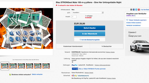 Angebote für Potenzmittel findet man mittlerweile beinahe wöchentlich auf den gängigen Auktionsportalen: Oft kommt es vor, dass ganze Packungen oder wie kürzlich Überbleibsel aus dem Medikamentenschrank des Opas zum Verkauf inseriert werden. Der Anbieter „filmmütze" wirbt aber mit Vielfalt: Mit „6 SEXPILLEN POTENZMITTEL200!&4Stück 20mg“ beschreibt er das Angebot „Potenzpillen zum Entdecken“.