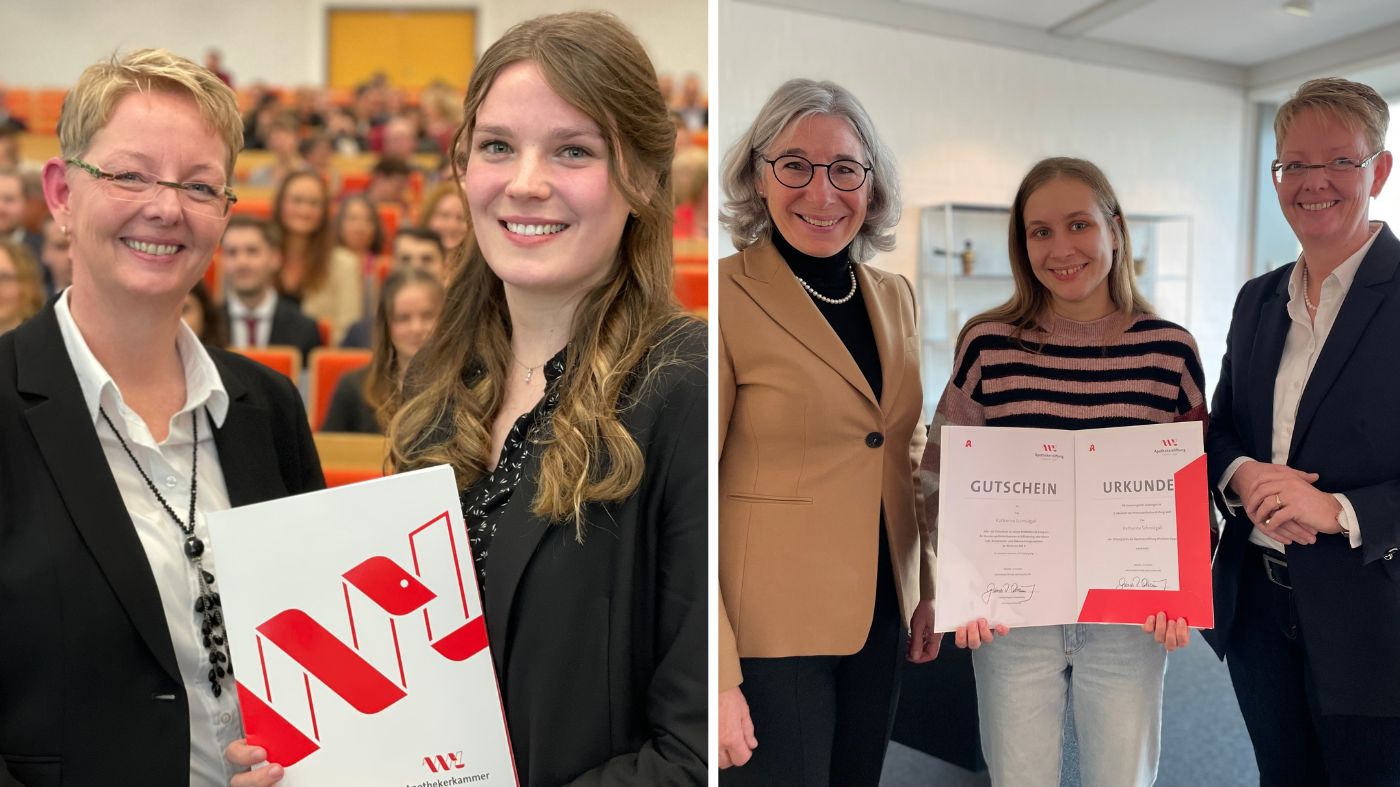 Die Apothekerstiftung der Kammer Westfalen-Lippe (AKWL) hat zwei angehende Apothekerinnen gewürdigt: Sie haben sich mit ihrem Pharmazieabschluss an der Universität Münster unter allen Absolventinnen und Absolventen besonders hervorgetan.