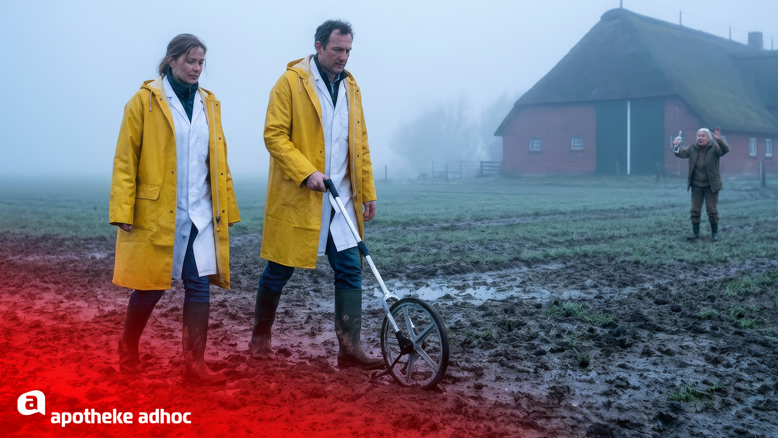 Unter den gelben Mänteln blitzen weiße Kittel hervor: Apotheker Hauke Groothusen-Sievers und PTA Frieda Koorts machen die Gegend unsicher. Der Apotheker schiebt einen Rolltacho vor sich her, ein kleines Messrad, das bei jedem Klick die zurückgelegte Strecke zählt: Klick-klick-klick, klick-klick, klick. Das monotone Geräusch durchbricht die Stille der Felder. Es ist ein seltsames Bild: Zwei Leute aus der Apotheke stapfen im Morgengrauen durch Matsch und Tau, als hätten sie sich morgens nach dem Aufstehen im Weg geirrt.