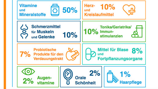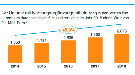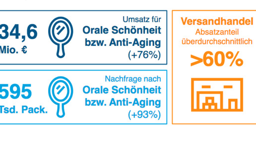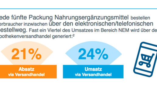 Tatsächlich floriert das Geschäft mit Nahrungsergänzungsmitteln in Apotheken. Der Umsatz stieg in den vergangenen fünf Jahren stetig um durchschnittlich 6 Prozent. Insgesamt wurden 2018 auf Basis der effektiven Apothekenverkaufspreise rund 2,1 Milliarden Euro mit Supplementen erwirtschaftet. Gewinner sind nicht nur die Vor-Ort-Apotheken – besonders Online-Anbieter profitieren von den Zuwächsen. Fast ein Viertel des Umsatzes wird laut Iqvia mittlerweile über den Apothekenversandhandel generiert. Besonders bei oralen Anti-Age-Produkten sei der Absatzanteil über den Versandhandel „überdurchschnittlich hoch“.