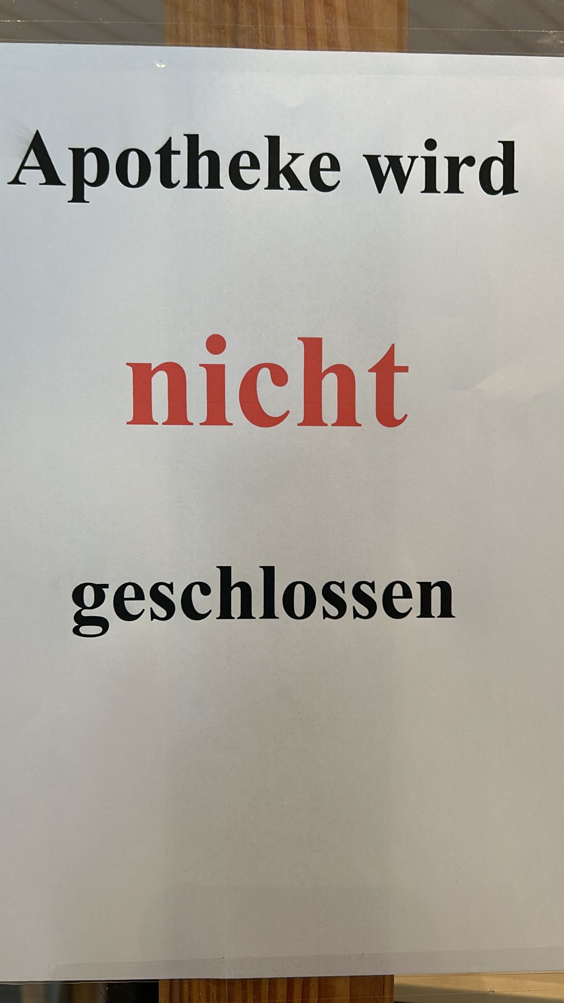 Vielmehr vermutet der Apotheker, dass die Kundschaft angesichts der vermehrten Schließungen etwas durcheinandergebracht hat. Denn immerhin sind die Schließungen von Apotheken allgegenwärtig. Erstmals ist die Zahl der Betriebe in Deutschland zur Jahresmitte unter die Marke von 17.000 gefallen. Zwar hat sich der Rückgang leicht abgeschwächt, laut Abda-Zahlen schlossen dennoch im ersten Halbjahr 238 Apotheken. „Die Leute erzählen irgendwas und verwechseln die Namen der Apotheken.“ Auch wenn er innerhalb seiner Gemeinde noch nichts von der angeblichen Schließung gehört hat, sah er sich veranlasst, Plakate aufzuhängen. Sogar die Lokalnachrichten kamen vorbei und fragten ihn zur Betriebsaufgabe aus.