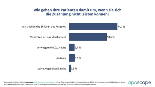 In diesen Fällen verschieben die Betroffenen das Einlösen des Rezepts laut drei Viertel der Befragten (75 Prozent) auf einen späteren Zeitpunkt. Viele Patienten verzichten jedoch auch auf das benötigte Arzneimittel, gaben 59 Prozent der Teilnehmer an. In Einzelfällen versuchen die Versicherten auch, die Zuzahlung zu verweigern oder bitten gar Passanten vor der Apotheke um Hilfe.