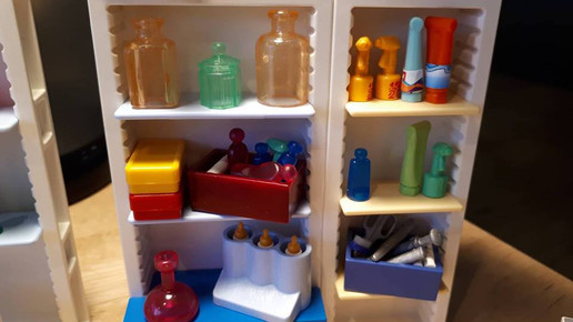 Das Freiwahlsortiment der Playmobil-Apotheke ist riesig: Es gibt drei verschiedene Sonnencremes – aber keine einzige Arzneimittelpackung. Aus den Augen eines Kindes gesehen ist das vermutlich so. Nah an der Grenze der Apothekenüblichkeit bewegen sich die Kosmetikartikel – vom Schminkpinsel und -spiegel über den Lippenstift bis zum Kajal ist alles zu haben. Die Kasse ist ein freistehender Monitor mit schnurloser Tastatur mit vielen bunten Knöpfen. Es gibt einen Präsentationstisch in Couchtisch-Format und zwei Sitzgelegenheiten. Außerdem die unvermeidliche Waage.