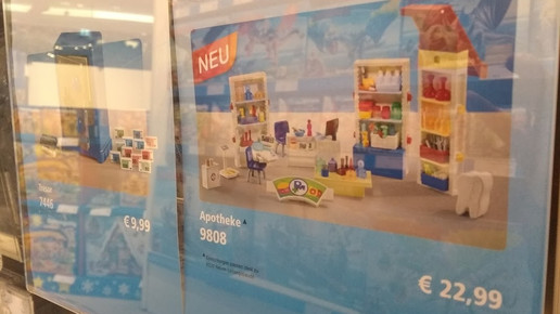 Die bereits seit einigen Jahren erhältliche Apotheke läuft unter „Zubehör und Ergänzungen“: Gekauft wird im eigentlichen Sinne nur die Inneneinrichtung. Für die Räumlichkeiten muss ein neues Ladengebäude gekauft werden, welches Bodenplatte, Außenwände, Vordach und Markise enthält. Zu erkennen ist die Apotheke außen an einem großen Schild, auf dem ein Tiegel, eine Tube und ein grünes Kreuz zu sehen sind, dazu die Buchstaben PM.