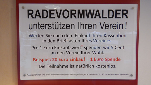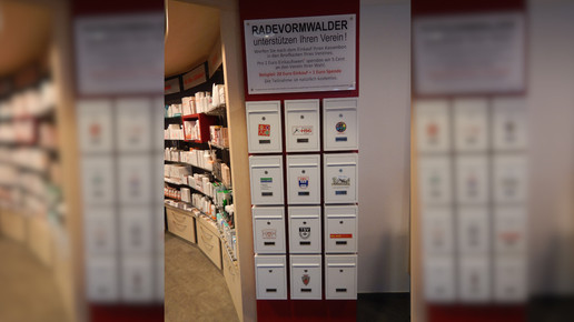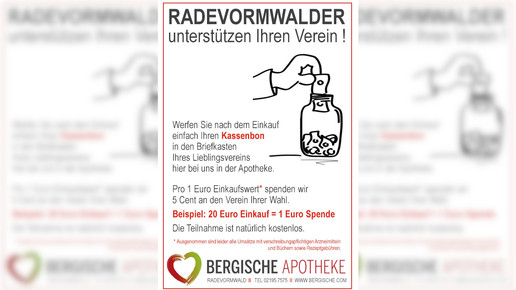 Im nordrhein-westfälischen Radevormwald steht ein reges Vereinsleben. Ganze 125 Vereine gibt es nach Angaben des Rathauses in der 22.000 Einwohner-Stadt. Apotheker Dr. Ralph Bültmann liegen die Vereine besonders am Herzen. Deswegen startete der Inhaber der Bergischen Apotheke eine Spendenaktion. In seinem Betrieb hing er zwölf Briefkästen auf, die für je einen Verein gelten. Die Kunden können ihre Kassenbons dort hineinwerfen. Fünf Prozent der Kaufbeträge gehen zum Ende des Quartals an die jeweiligen Vereine.