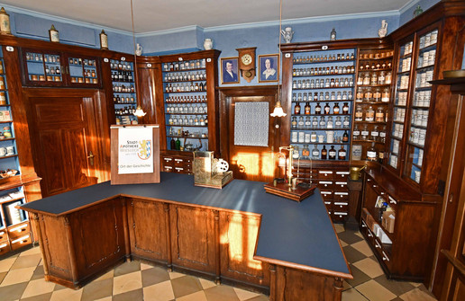Neben dem modernen, ebenerdigen Teil, in dem Jutta Suchy über 40 Jahre die Stadt-Apotheke in der Innenstadt führte, geht es links am modernen Eingang vorbei zur historischen Apotheke. Diese ist über eine Treppe zu erreichen, deren Original-Inventar aus der Betriebszeit von 1858 bis 1966 nahezu vollständig erhalten ist.