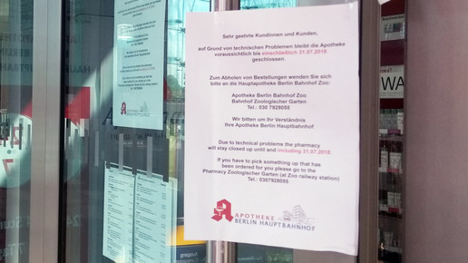 Die in derselben Straße gelegene Bahnhof-Apotheke dagegen behielt ihre Schotten dicht. „Wir haben die Tür zugelassen und den Kunden durch die Notdienstklappe vom Stromausfall berichtet“, sagt Pharmazeut Johannes Frey. „Arzneimittel konnten wir ohnehin nicht ausgeben, da unser Kommissionierer den Geist aufgegeben hatte.“ Auch hier habe es etwa eine halbe Stunde gedauert, bis alles wieder ordnungsgemäß funktionierte.