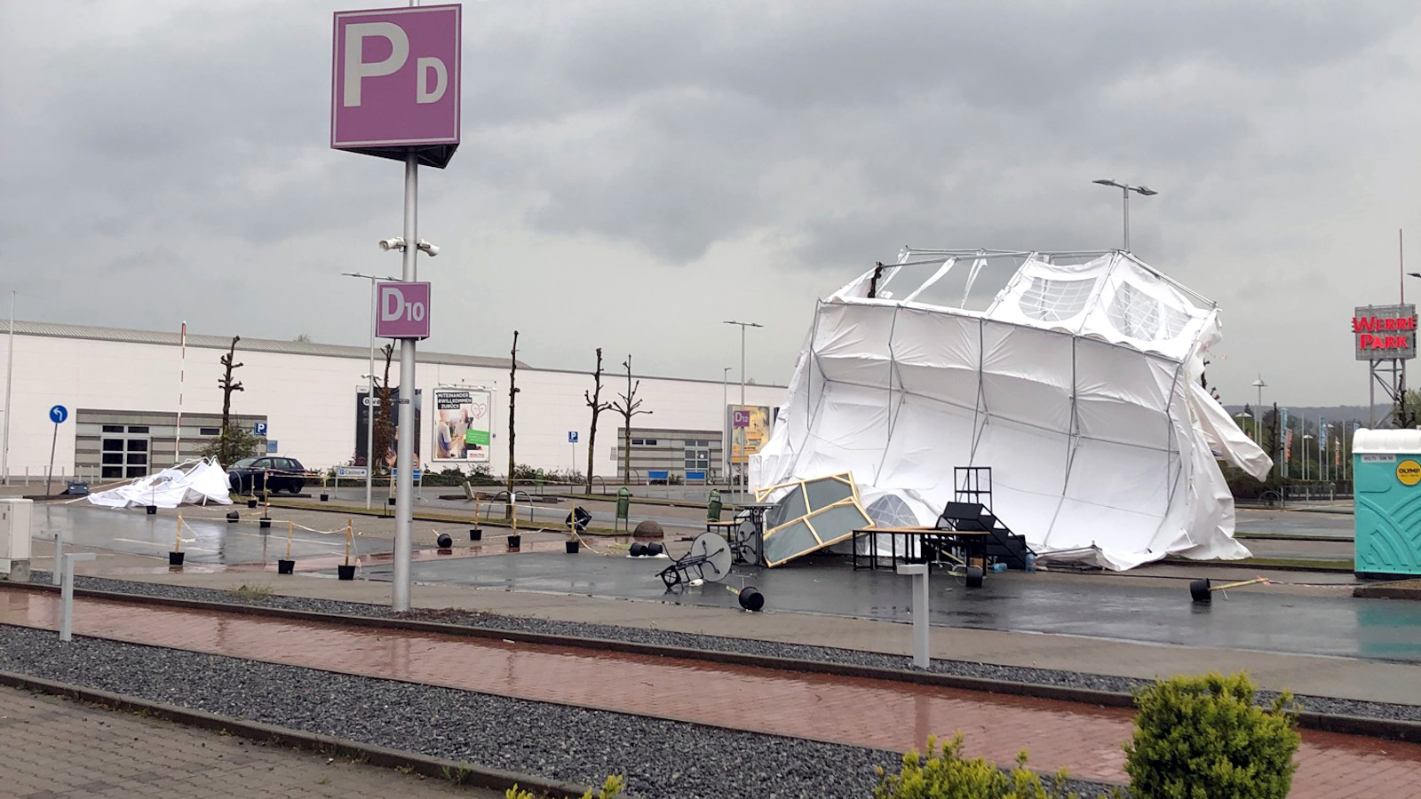 Der durchziehende Sturm sorgte den Angaben zufolge im gesamten Kreis Minden-Lübbecke im Nordosten Nordrhein-Westfalens für Einsätze. In Minden stürzte ein Baum auf ein geparktes Auto. Auch wegen umherwirbelnder Gegenstände – darunter ein mobiles Klo und ein Trampolin – rückte die Polizei aus.