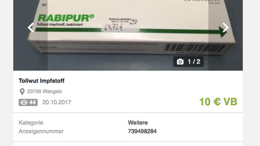 „Original Tollwutimpfstoff. Hauptsache muss nicht verfallen, gerne im Tausch auch gegen drei Tafeln Dunkle Schokolade“, beschreibt Susanne aus Wangels. Seit 20. Oktober besteht das Angebot aus Schleswig-Holstein. Der Preis ist mit zehn Euro zur Verhandlungsbasis festgelegt. Der Tollwut-Impfstoff Rabipur läuft jedoch mit einem Verfalldatum von Dezember 2017 bald ab.
