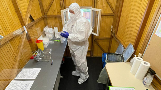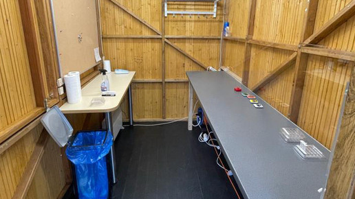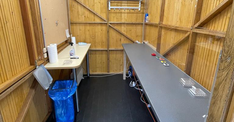 In die Tür des Holzhäuschens sei ein Loch geschnitten worden, worüber der Abstich gemacht werde. „Über der Seitentür wurde außerdem ein Dach wegen der Anonymität der Testpersonen gebaut.“ Zudem seien eine Klimaanlage und ein Heizlüfter eingebaut worden. Die zweite Alternative für die fehlenden Räumlichkeiten ist ein Donut-Anhänger. Er sei als eine mobile Teststelle konzipiert und könne beispielsweise bei Firmen vorfahren.