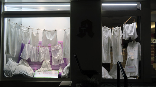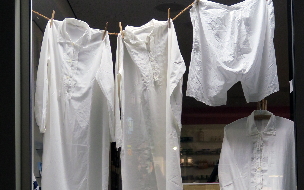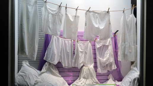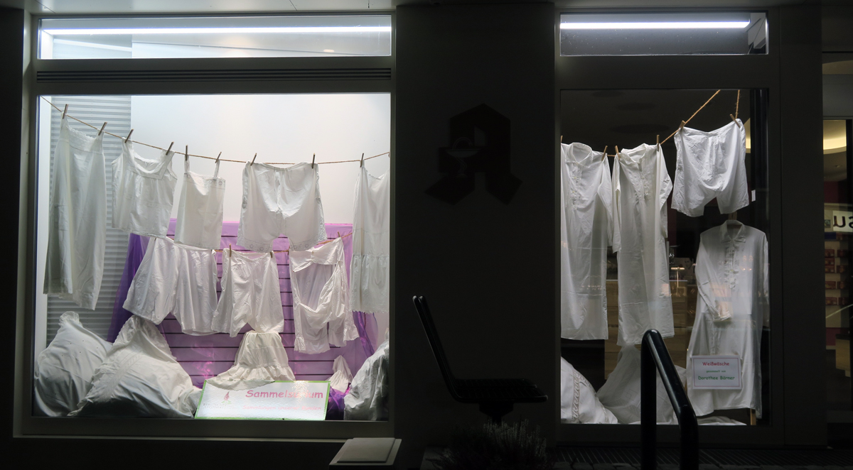Wie lockt man Kunden vors Schaufenster und in die Apotheke? Apothekerin Ursula Buhlmann aus Wermelskirchen weiß, wie das geht: Bei ihr bekommen sammelnde Kunden eine Bühne. Diesmal ist schicke Unterwäsche von anno dazumal zu sehen.