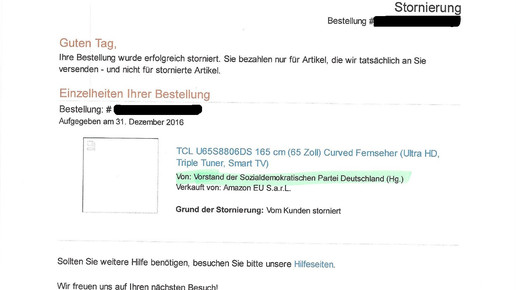 Überraschend für den verhinderten Käufer war die Bezeichnung des Verkäufers unterhalb der ordnungsgemäßen Bezeichnung des Modells: „Vorstand der Sozialdemokratischen Partei Deutschland.“ „Von der SPD hätten wir sowieso nicht gekauft“, so der Ehemann verwundert und mit einem Lachen. Hätte er das vor der Bestellung gewusst, hätte er sich für ein anderes Angebot entschieden.