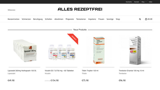 Bei alles-rezeptfrei.net gibt es keine Siegel oder Sicherheitsmerkmale. Nur das eine simple Leistungsversprechen: Hier gibt’s alle Arzneimittel ohne Rezept. Angeboten wird alles, was das Herz einer bestimmten Kundenklientel höher schlagen lässt: Clenbuterol für Sportler, die mit ihrem Training alleine nicht weit genug kommen. Ritalin für Klausuren-geplagte Studenten. Anabolika für Bodybuilder. Potenzmittel von Levitra bis Viagra für alle, die ihre Leistungsfähigkeit andernorts optimieren wollen. Dies alles und vieles mehr lässt sich ganz problemlos auf der Website ordern, und zwar ohne Rezept. Tilidin wird neben Testosteron-Injektionen ebenso angeboten wie Vicodin neben Xenical und Reductil.
