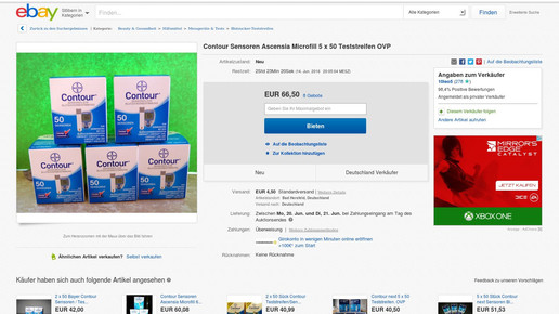 Der Händler mit dem Namen 10leo5 ist seit Juli 2010 Mitglied bei Ebay. Die Plattform nutzte er zuletzt vor allem für den Verkauf von Teststreifen. Aktuell bietet er die Hilfsmittel für das Gerät Accu-Chek Mobile und Accu-Chek Aviva von Roche an. Zur Auktion stehen jeweils fünf Packungen à 50 Stück. Das höchste Gebot liegt bei 11,50 Euro; die Auktion läuft noch.