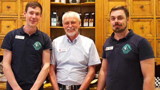 Noch teilen sich Dominic Kram und sein Vater den Titel des Inhabers. Bald wird Bernhard, der derzeit an seiner Promotion arbeitet, für den Senior aufrücken. „Ich hoffe aber, dass mein Vater auch danach noch oft in der Apotheke ist. Und sei es, um mit den Leuten zu sprechen“, so Kram. Denn das sei eben die Funktion der Marien-Apotheke im Ort: „Wir sind Freunde und Ansprechpartner, auch für private Themen. Vertrauen und Empathie kann das Internet nicht leisten.“ Dass das Dreigestirn sich in der Apotheke auf den Füßen steht, glaubt Kram nicht: „Arbeit ist genug, da gibt es keinen Ärger. In den wichtigen Fragen sind wir uns ohnehin immer grün.“