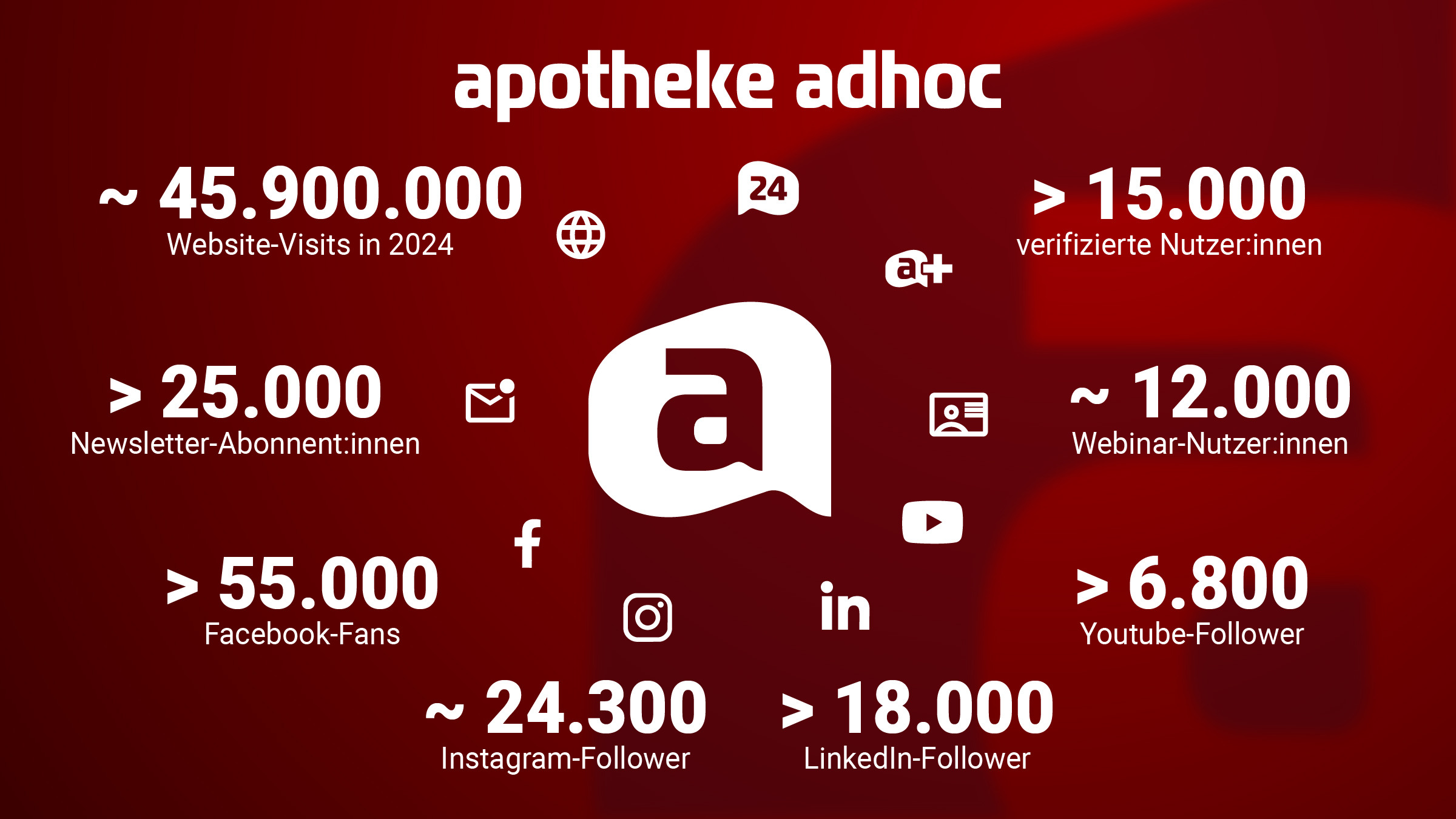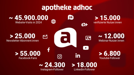 Ebenso kontinuierlich wachsend wie die Besucherzahl der Webseite ist die Anzahl der Abonnent:innen des Newsletters von APOTHEKE ADHOC. Mehr als 25.000 Leser:innen erhalten täglich aktuellste Informationen aus Pharma und Apotheke. Und wer seine News bevorzugt aus den Sozialen Netzwerken zieht, kann auf die vielfältigen Social-Media-Kanäle von APOTHEKE ADHOC zählen. Mit rund 55.000 Fans auf Facebook, 24.300 Followern bei Instagram, 18.000 Followern bei LinkedIn und mehr als 6800 Followern bei YouTube generiert das Redaktionsteam täglich massive Reichweiten und baut seine Fach-Community konsequent aus.