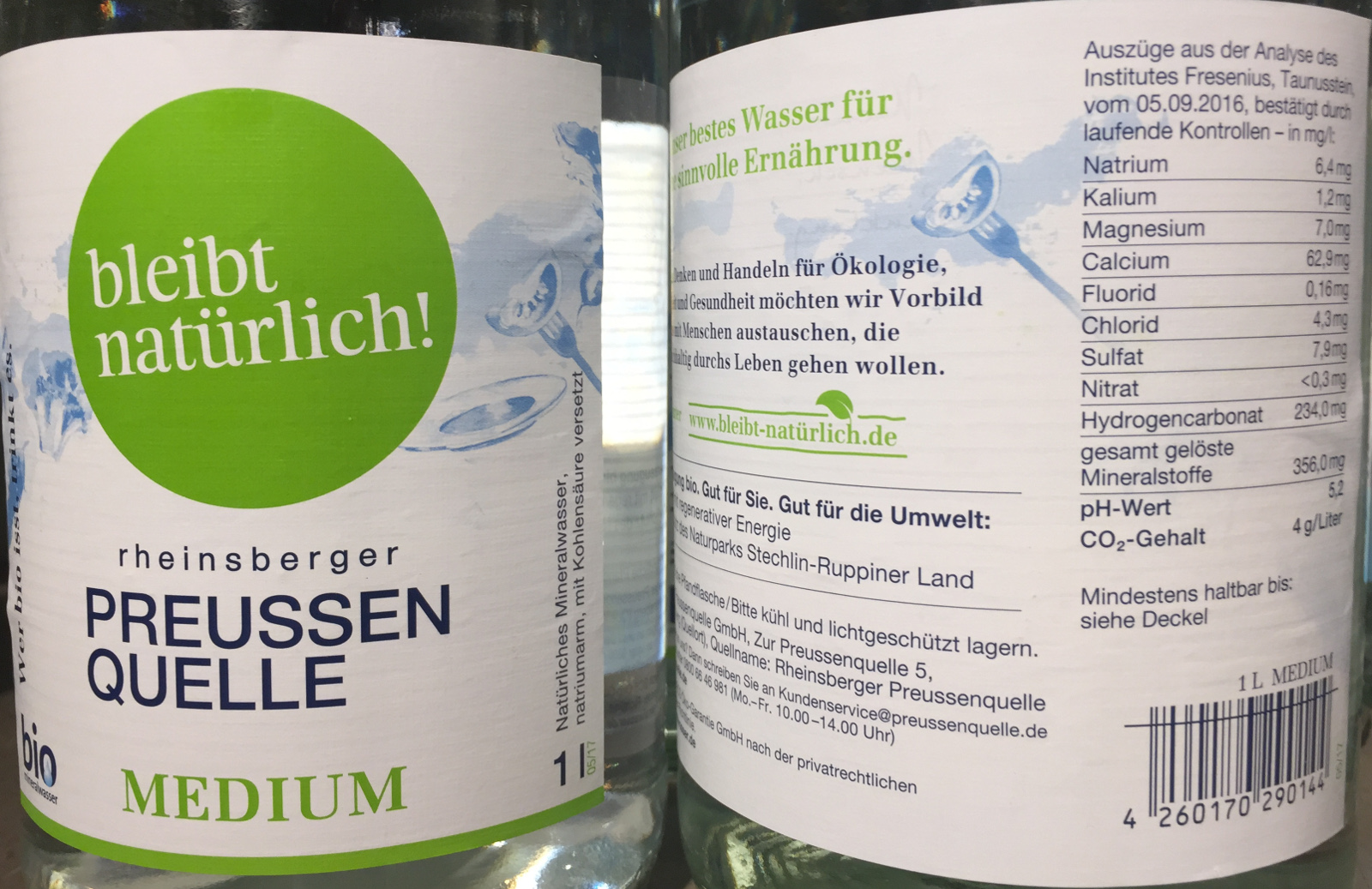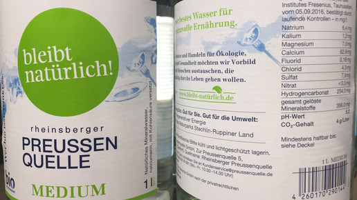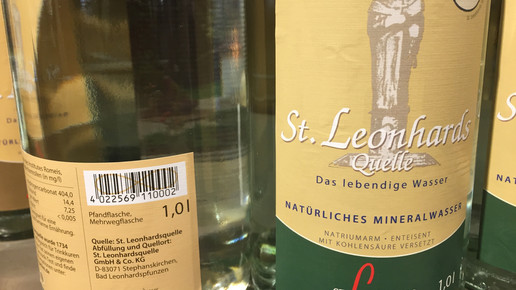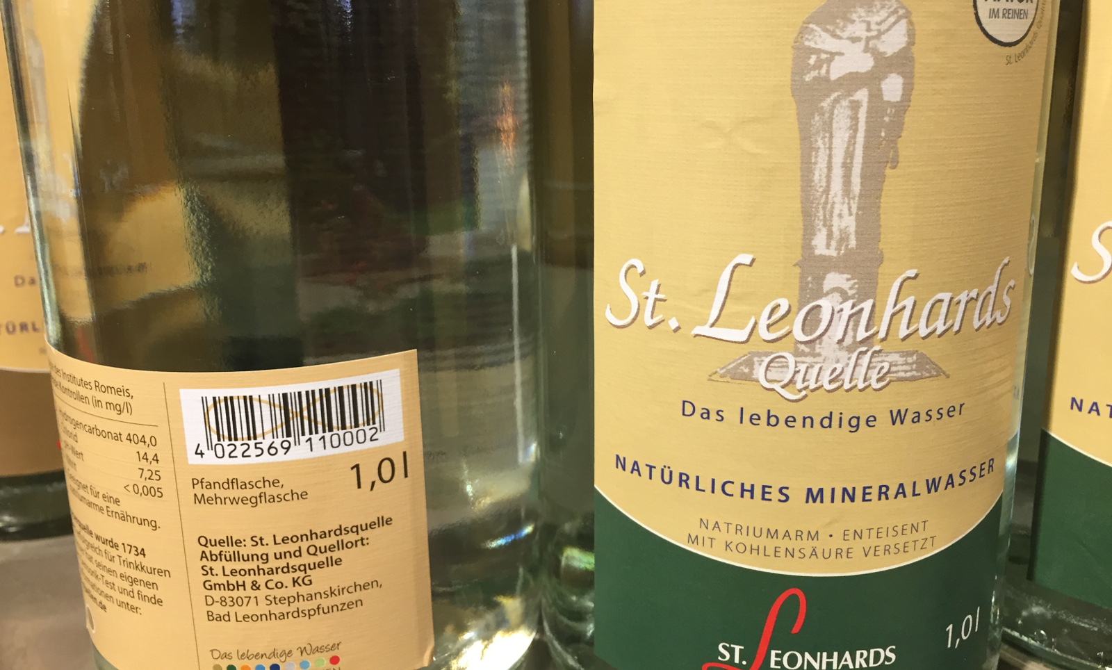 Zwei Hersteller von Mineralwässern entstören ihren Strichcode noch: St.Leonards Quelle mit einem Unendlichkeitszeichen und die Rheinsberger Preussenquelle mit einem Strich.