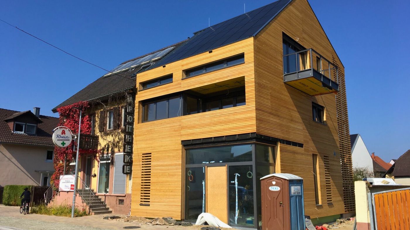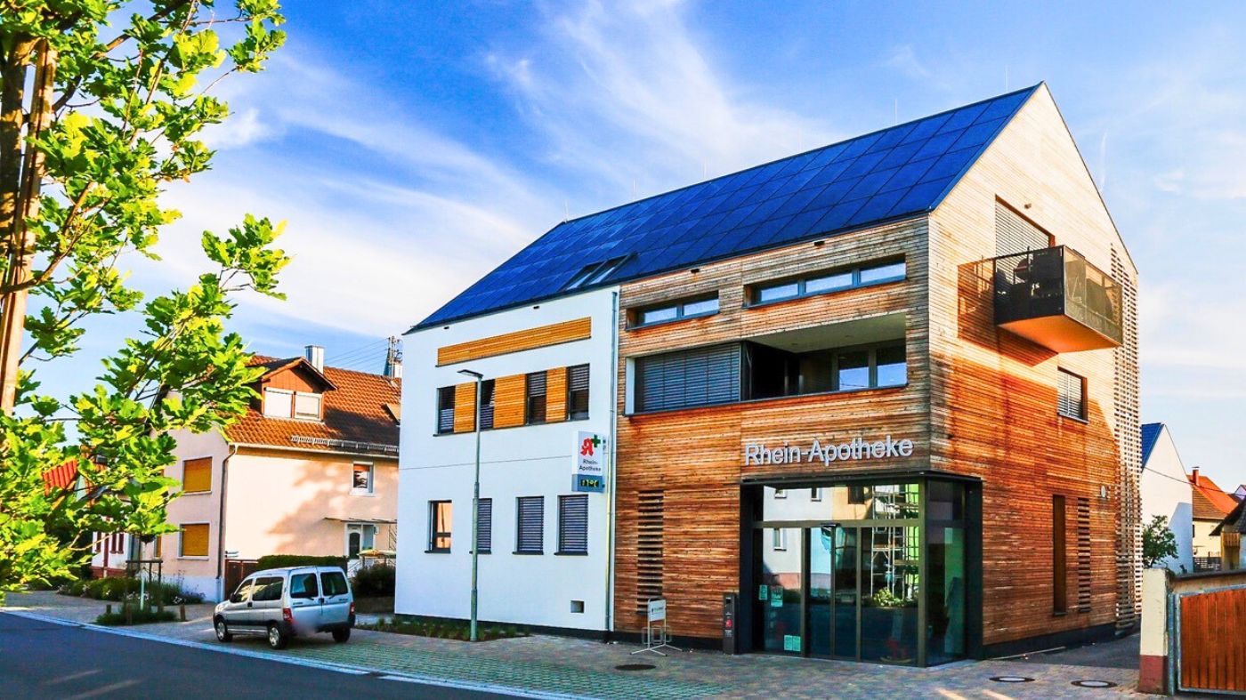 Der Neubau hat eine Fassade aus Vollholz – schon allein wegen der Statik und dem Brandschutz, wird energieeffizient beheizt und gekühlt und hat auf dem Dach eine vollflächige Photovoltaik-Anlage. Die versorgt nicht nur das Gebäude mit Apotheke und den vier darüber liegenden Wohnungen mit Strom, sondern auch die beiden E-Autos, die der Inhaber und der Botendienst nutzen.
