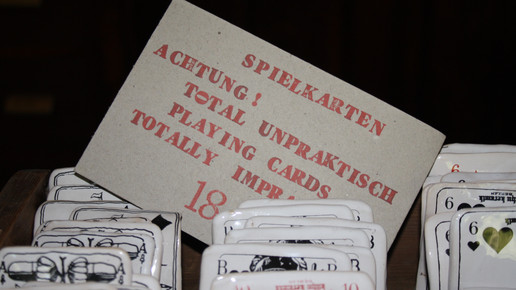 Es gibt auch Ulkiges, Dinge, die den Betrachter innehalten und lächeln lassen. Die Keramik-Spielkarten zum Beispiel. Wer sie kauft, ist selbst schuld. Schließlich steht „Spielkarten, Achtung! Total unpraktisch!“ auf dem Verkaufsschild. Wer seine Ware so anpreist, muss ganz schön, ja, was denn eigentlich? Selbstbewusst sein? Darauf hoffen, dass seine Kunden das auch gut finden oder ein ungewöhnliches Geschenk suchen? Vermutlich ist es eine Mischung aus allem.
